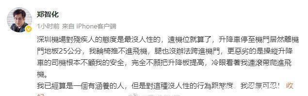 【明星亲述:连滚带爬才进机舱】据郑智化微博描述,当时机场的升降车与机舱门地板存在高达25公分的落差,导致他的轮椅无法推进,自身因腿脚不便也难以跨入机舱。更令他愤慨的是,操纵升降车的司机完全不愿配合调整高度,只是冷眼旁观,最终他不得不以“连滚带爬”的狼狈方式才得以进入飞机。